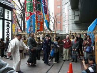 だいぶ暖かくなってきました、いかがお過ごしでしょうか。3月15日大相撲春場所観に行きました。入り口には力士ののぼりが立っていて、相撲案内所の前を通って、館内に。